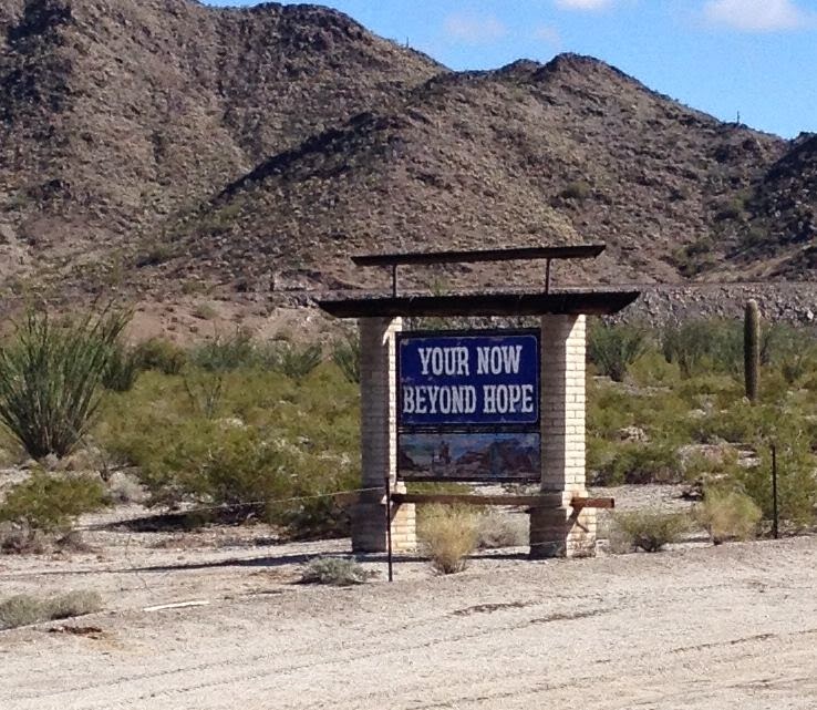 On the map that stretches from Palm Springs to Phoenix, Brenda isn't shown but is a tiny village 17-miles west of Hope. Aside from desert and collections of RV campers there is very little along this route.